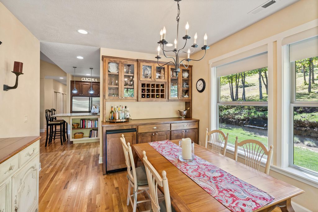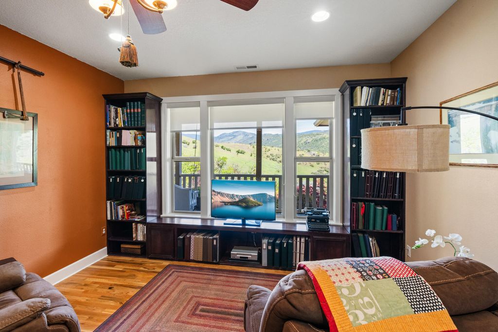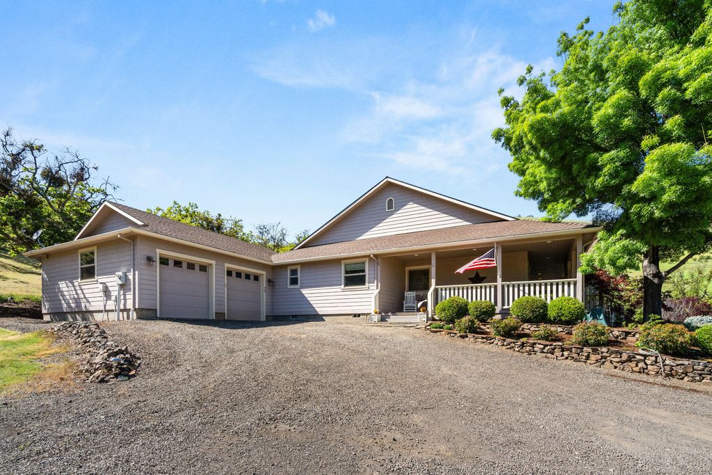 Country living on just over 23 acres of rolling green hills & mountain views. Home w/ wide covered porch for vistas from sunrise to sunset. Beautiful hardwood floors throughout open-concept design. Vaulted great room w/ fireplace & expansive windows. Gourmet kitchen w/ granite countertops, island w/ seating, ss appliances, & flow to formal dining room w/ custom built-in cabinetry & door to patio for. Primary suite is at one end of home, w/ walk-in closet, private bath w/ double sinks & walk-in shower, door to back patio & private exercise room. 2 more bedrooms & full bath w/ jetted tub & shower are at opposite end for privacy. Office w/ custom built-ins & laundry room w/ sink. Oversized two-car garage w/ workspace & half bath w/ mudroom entry. RV parking area w/ hookups. Outside is a covered patio, garden area, & sprinkler system. Minutes from hiking, dining, 2 wineries, Emigrant Lake County Park. 8 minutes from shopping center.