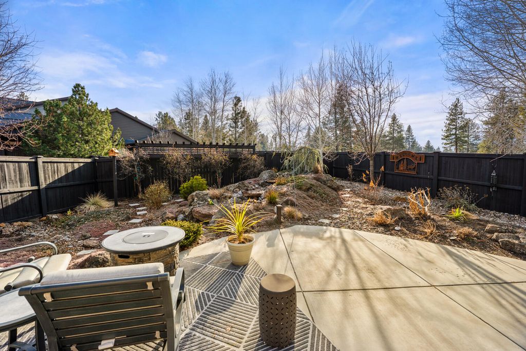 Fully fenced backyard accessed from both the great room and primary suite includes a water feature, large patio, and low-maintenance landscaping. Excellent storage throughout with walk-in pantry, spacious hallway closet, laundry room with ample counter space and cabinetry, and a roomy garage with built-in storage and 220V electric. Convenient access to Central Oregon amenities and recreation.
