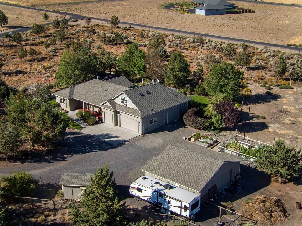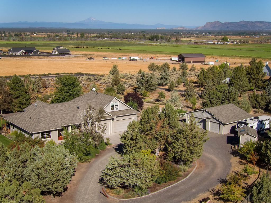 Custom 2279 sq ft home situated on 4.84 acres with beautiful Smith Rock and Cascade Mountain Views. The inviting great room design features vaulted ceilings, propane fireplace, and a built-in entertainment center, creating an ideal setting for both everyday living and entertaining. The kitchen offers new quartz countertops, stainless steel appliances, a breakfast bar, and an adjacent dining area, complemented by hardwood floors throughout. Main level primary suite provides comfort and privacy with a tile shower, and walk-in closet. Home has a utility room, 3rd bedroom/Office and Bonus Room approve garage. Outdoor living is enhanced by a covered front porch and a rear patio with hot tub, landscaping, a tranquil water feature. Additional amenities include a triple attached garage, detached three car garage/shop, raised garden beds, two RV hookups, and a fully fenced, private gated setting, all located in a quiet neighborhood with convenient access to Redmond, Prineville, and Bend.