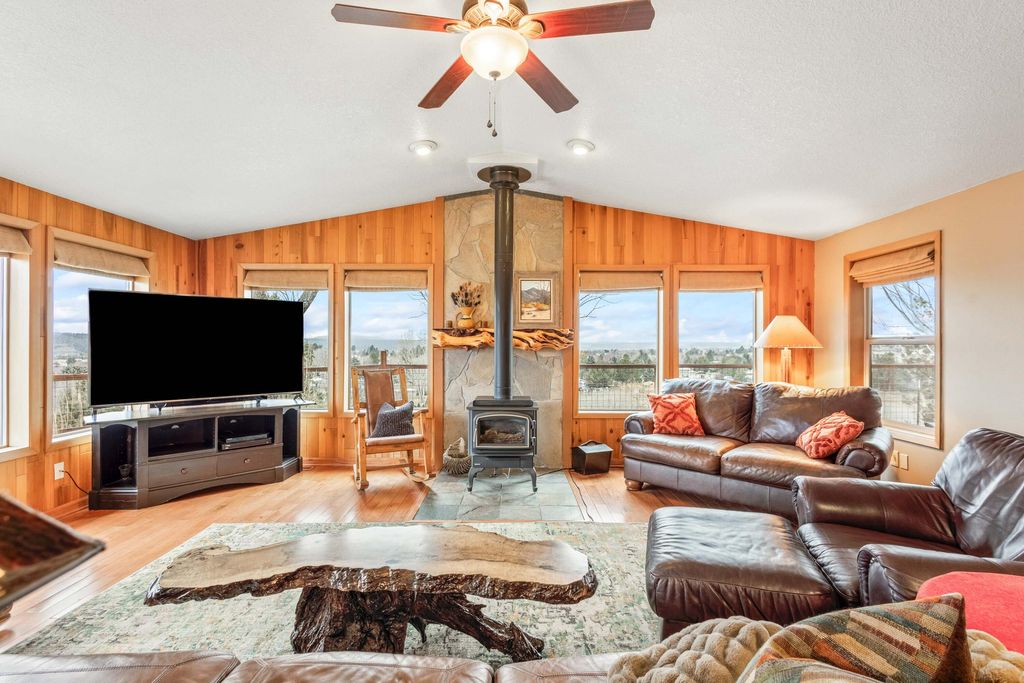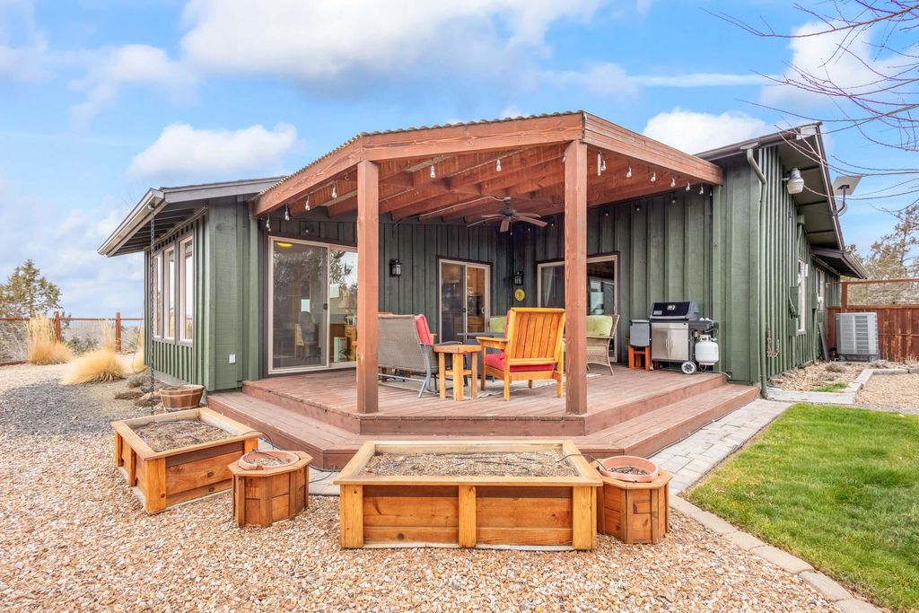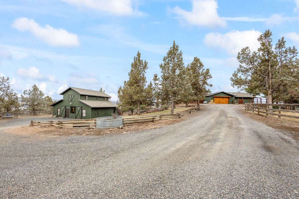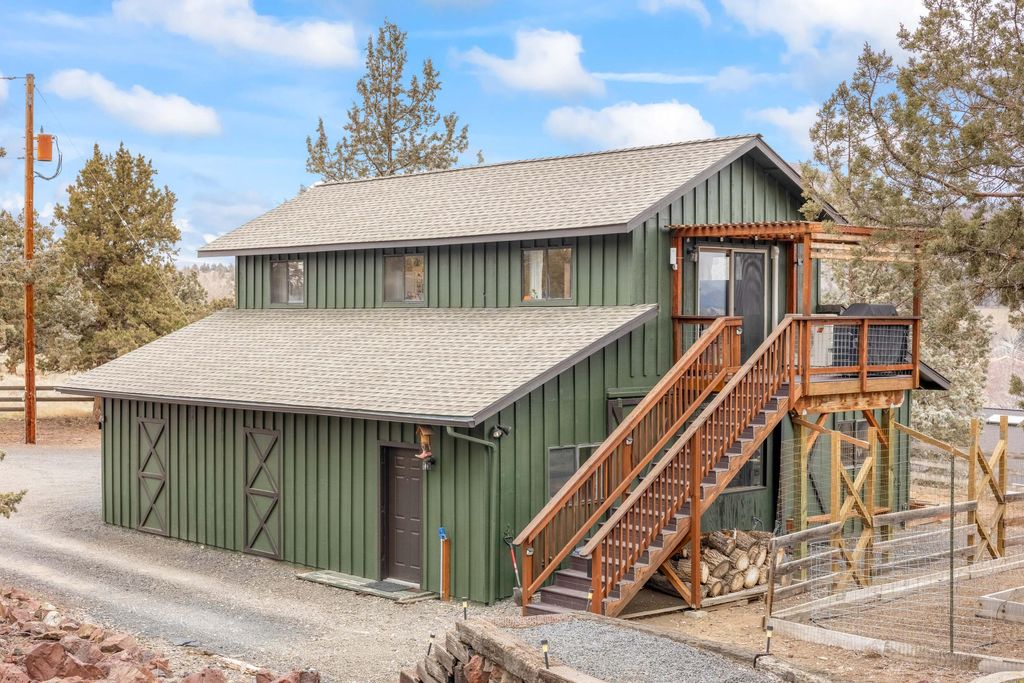 Best location in Prineville! This rare 3.99-acre property offers breathtaking 360* views of the valley, Barnes Butte, & the Cascade Mountains w/complete privacy & serenity. The Craftsman style home features an updated kitchen w/leathered granite countertops, custom wood cabinetry, gas range, & all appliances included. Natural light and views pour in from every window. The home offers 1,804 sq ft w/2 spacious bedrooms + a sunroom/office, along w/an updated primary bath featuring a tiled walk-in shower. PLUS a 1,296 sq/ft shop w/propane heat includes a guest apartment above (not included in sq ft) w/1 bed & 1 bath, kitchenette, mini-split system, & incredible views of Barnes Butte. The property is completely solar powered and there may be potential to subdivide. Garden, pastures, front & back decks w/views from every corner. Truly a one-of-a-kind property that rarely comes available.