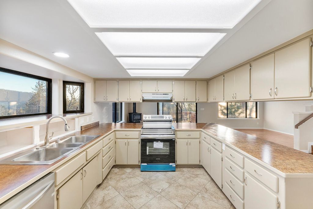 The kitchen features a pantry, dumbwaiter, and direct access to the deck, with an open layout and a must-see view from the kitchen window. A wood-burning stove adds warmth to the living area, and the wraparound deck extends the living space outdoors.