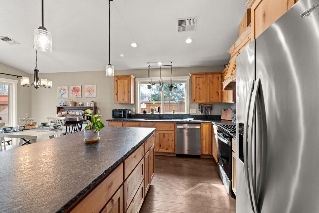 Beautifully maintained single-level home built in 2020, offering the perfect blend of modern style and everyday comfort. This 3-bedroom, 2-bath home features 1,626 sq ft of thoughtfully designed living space with an open-concept layout ideal for both relaxing and entertaining. The spacious kitchen showcases granite countertops, stainless steel appliances, a large island, and ample cabinetry, flowing seamlessly into the great room with soaring ceilings and abundant natural light. The private primary suite includes a walk-in closet and a well-appointed ensuite bath with dual sinks and a walk-in shower. Step outside to a fully fenced backyard with a covered patio--perfect for outdoor dining or quiet evenings. Situated on a manageable lot in a desirable neighborhood, this move-in-ready home offers modern living with convenience and quality throughout.