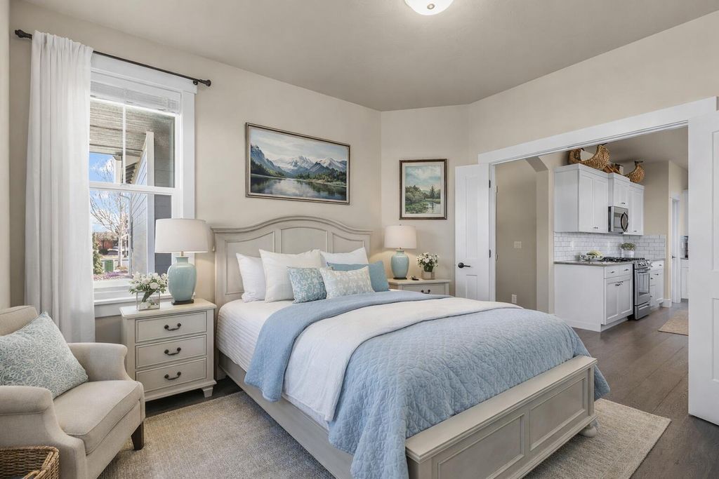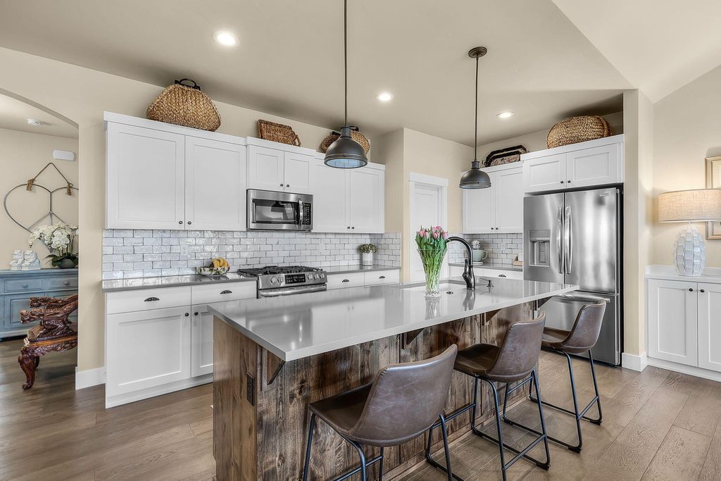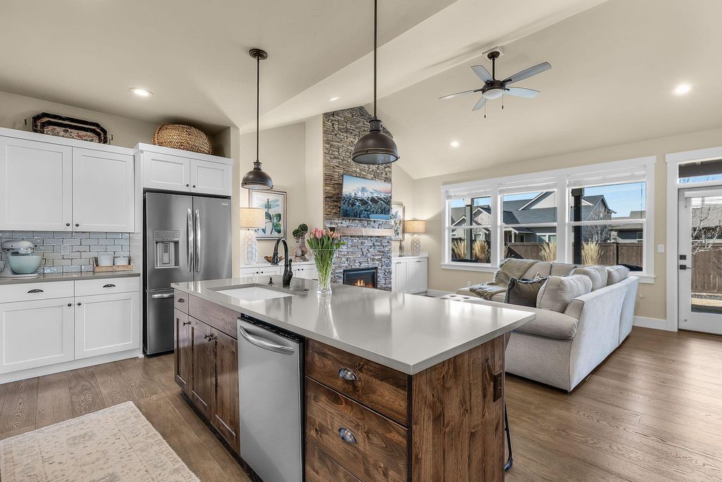 Beautiful single-level home on a private corner lot in the highly sought-after Prairie Crossing neighborhood. Light and bright with a vaulted great room and open kitchen featuring a large island and under-cabinet lighting, perfect for entertaining. The great room showcases a floor-to-ceiling stacked rock fireplace and hardwood flooring throughout the home.