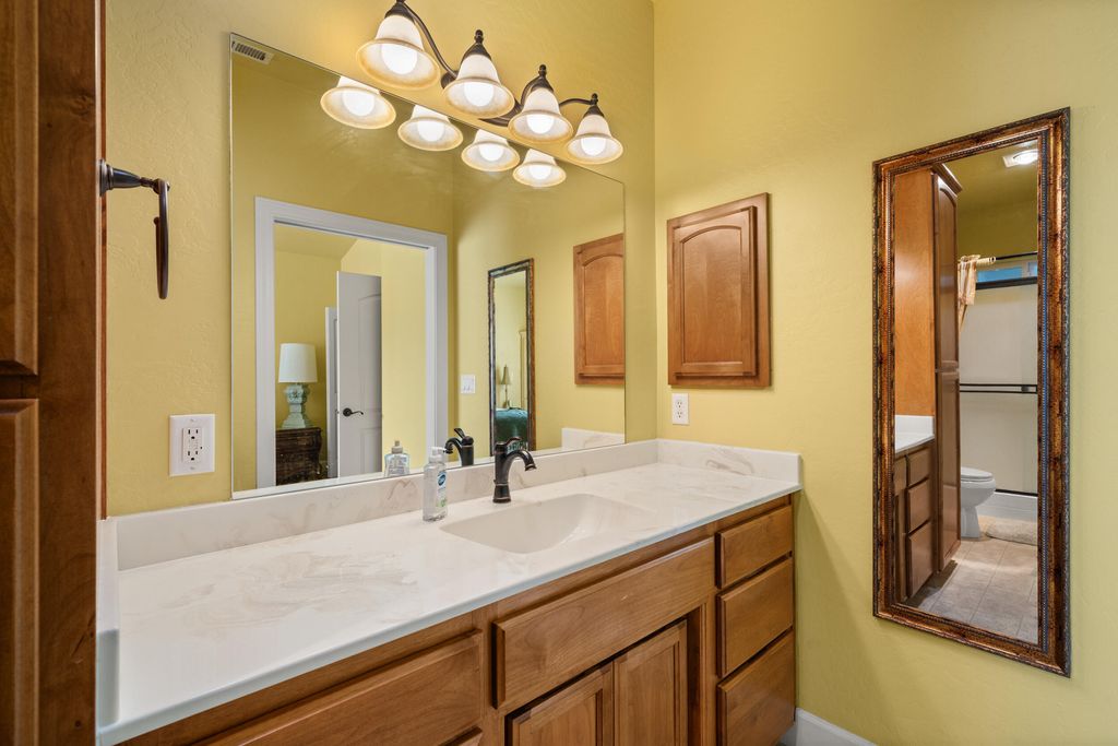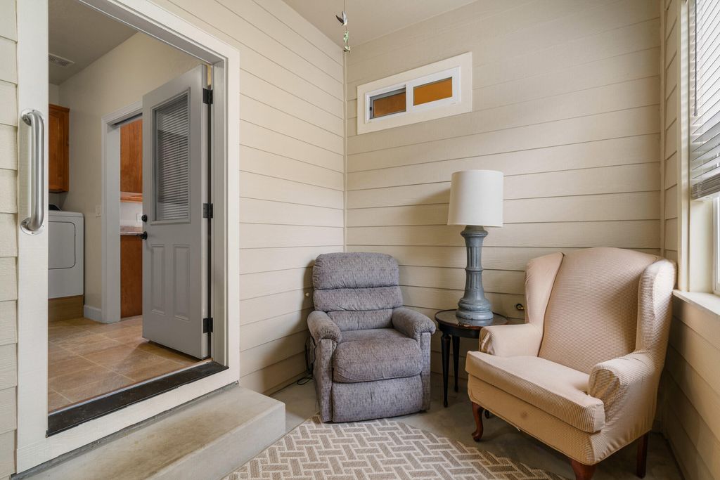 This is the perfect home specifically built for aging in place! THIS is one of the many reasons Twin Creeks Development has won all the awards. Wide hallways, wide doorways, walk through showers, low maintenance backyards and this one even features a ramp in the garage for zero step entry! With beautiful waterproof wood laminate throughout and vaulted ceilings, you'll love living here. Previous seller upgraded the kitchen with granite countertops and enclosed a portion of the porch area for extra storage/sitting room...all with HOA permission of course! Primary bedroom features vaulted ceilings and generous walk in closet. Utility room features cabinetry, and pantry with pull outs and You won't want to miss this this rare end unit! Common wall is insulated concrete form construction (11'' thick with 6'' of poured concrete) Light and bright with soler tubes as well. Griffin Oaks Park is right behind the property (near the garage entrance)