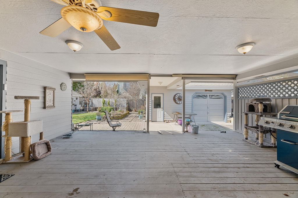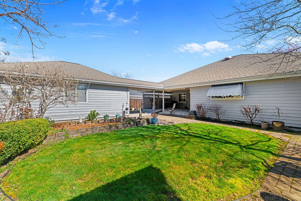 Quiet Central Point neighborhood with a beautiful landscaped yard! Backyard features a covered semi enclosed patio, a detached finished shop, and RV Parking. Home has a wonderful floor plan, vaulted wood ceilings, skylites, and a corner brick fireplace. The kitchen is new, quartz white counter tops, all white appliances, and cabinets. Dining/family room are a combination, and create a unique open living space. Master bedroom opens onto the covered patio, has a good sized bathroom, and walk in closet. The shop in the back is a dream and has could have multiple uses. Buyer to do own due diligence on permits and uses. (Home needs bathrooms & carpet updates, price reflects for buyers to to able to compete them.)