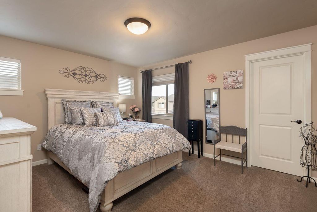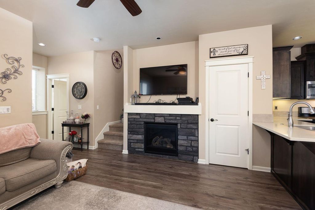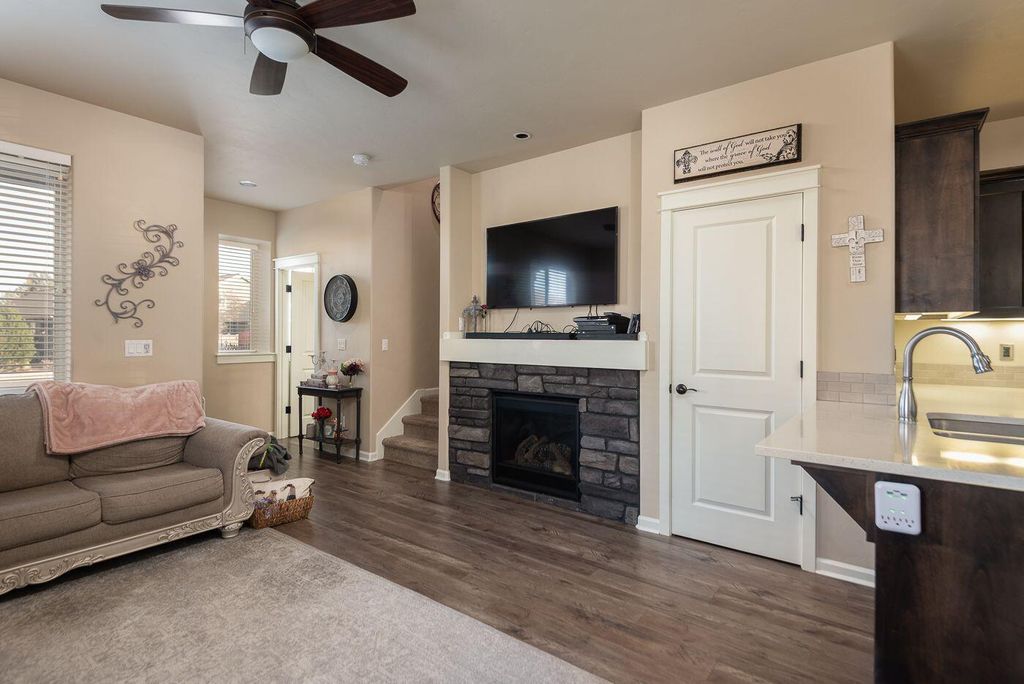 Popular corner-unit townhouse designed by Pahlisch Homes. This 1,471 sq ft home offers 3 bedrooms, 2.5 baths, upstairs bonus space perfect for a home office or sitting area. Spacious primary suite features, natural light, master bath features double vanity and walk in closets. Tall ceilings, oversized windows, and a skylight create a bright, airy feel throughout. Quality finishes throughout, including a stacked-stone gas fireplace, quartz countertops, LVP flooring, and convenient under-stair storage. Located in a quiet neighborhood with no through traffic, ample street and alley parking, and a private park with gazebo and playground. Convenient SW location with easy access to schools, the airport, highways, and nearby dining and coffee spots.