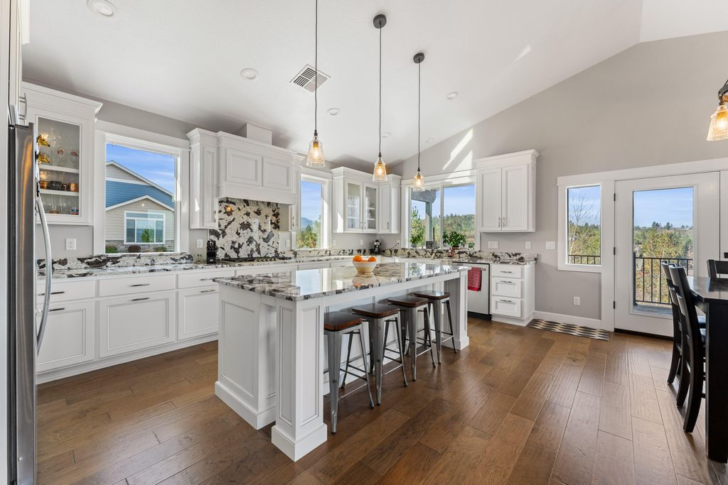 A Rare find in Grants Pass!! Absolutely Stunning views from every room and deck of this Custom Built home by Northridge. The home offers 2518 sq ft 3bed/2bath of living space with custom finishes, trims, and attention to detail. The front and back porches are elegantly stained for durability and look. The outdoor kitchen and pool (heated), make for the ultimate gatherings and pool parties. When you enter, you will be in aw of the wood floors, tall vaulted ceilings, and gas fireplace with Brick Hearth and reclaimed wood mantle. The open concept adds to a large open feel. The kitchen offers gorgeous granite counters, oversized island, double ovens, stainless appliances, wine fridge, soft close doors & drawers, custom designed cabinetry, and farmhouse sink. The windows allow for lots natural light, and stunning views of the mtns, the city, and the most amazing sunsets. The EnSuite is nothing short of spectacular, with large custom tile shower, dbl vanity, and walk in closet. Must Tour