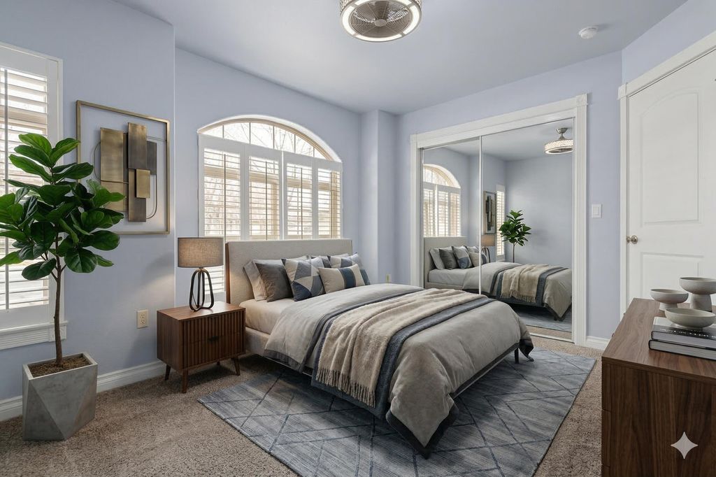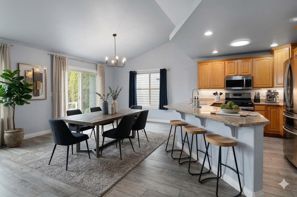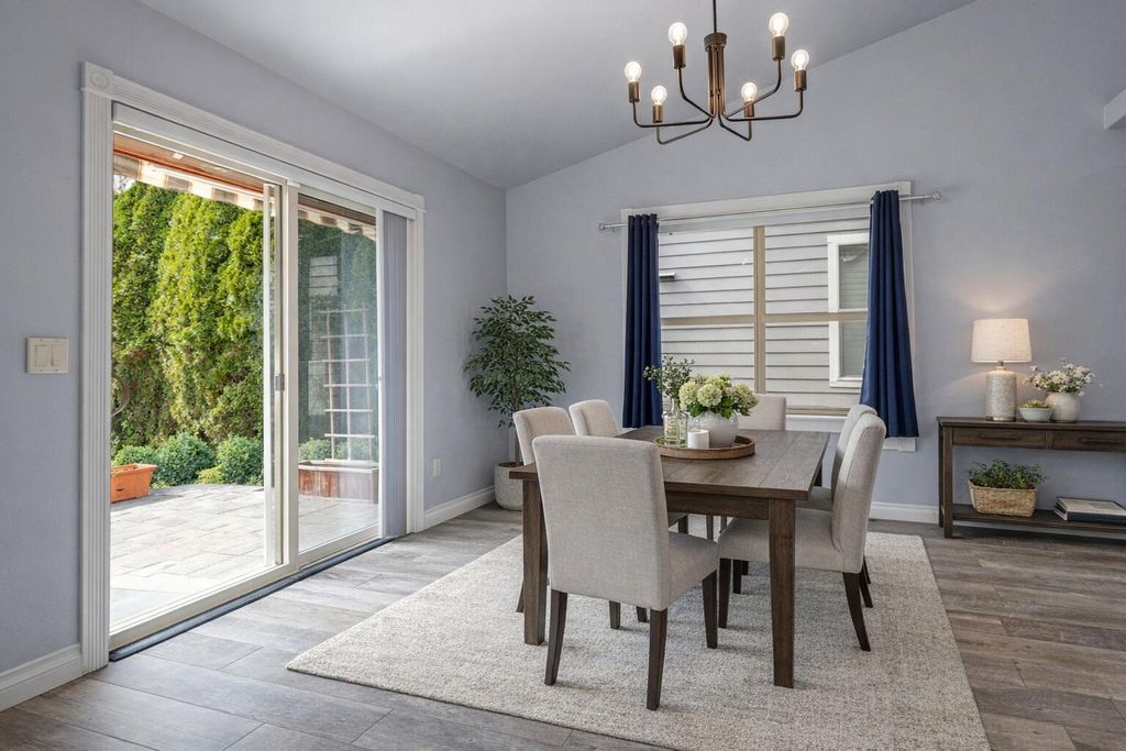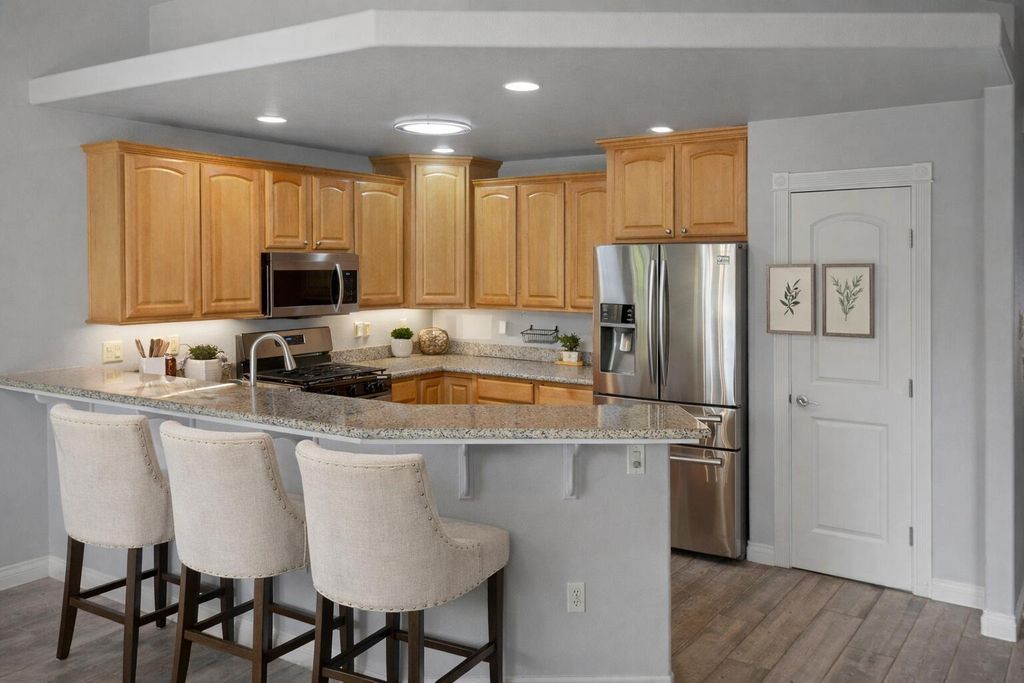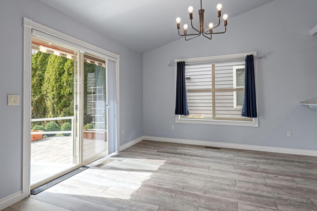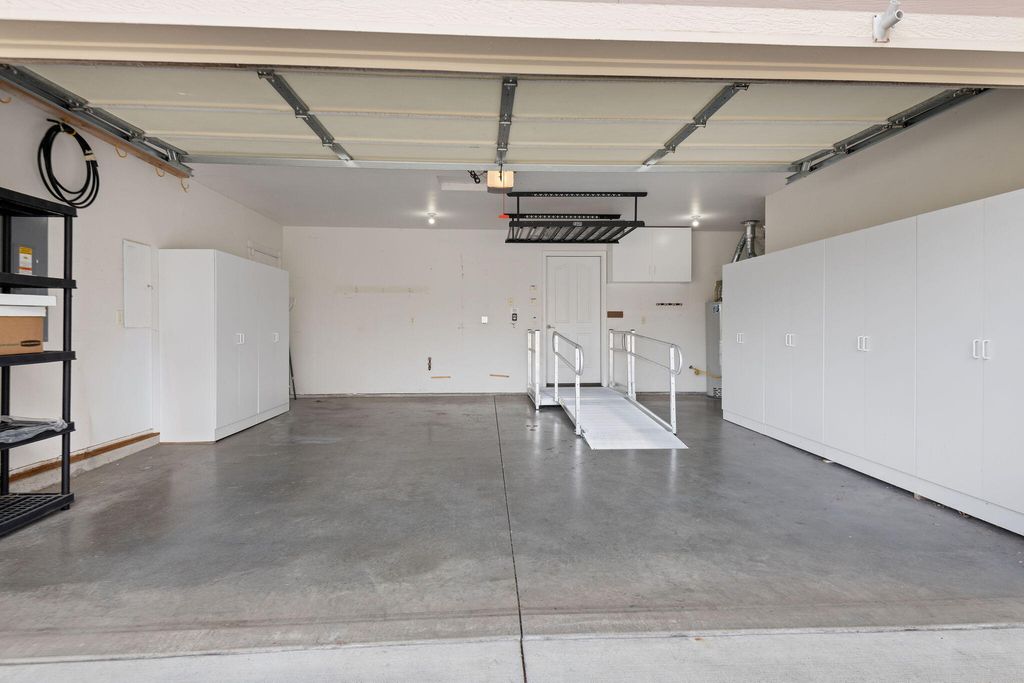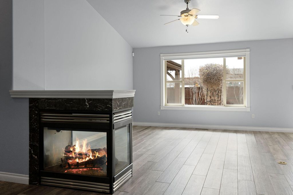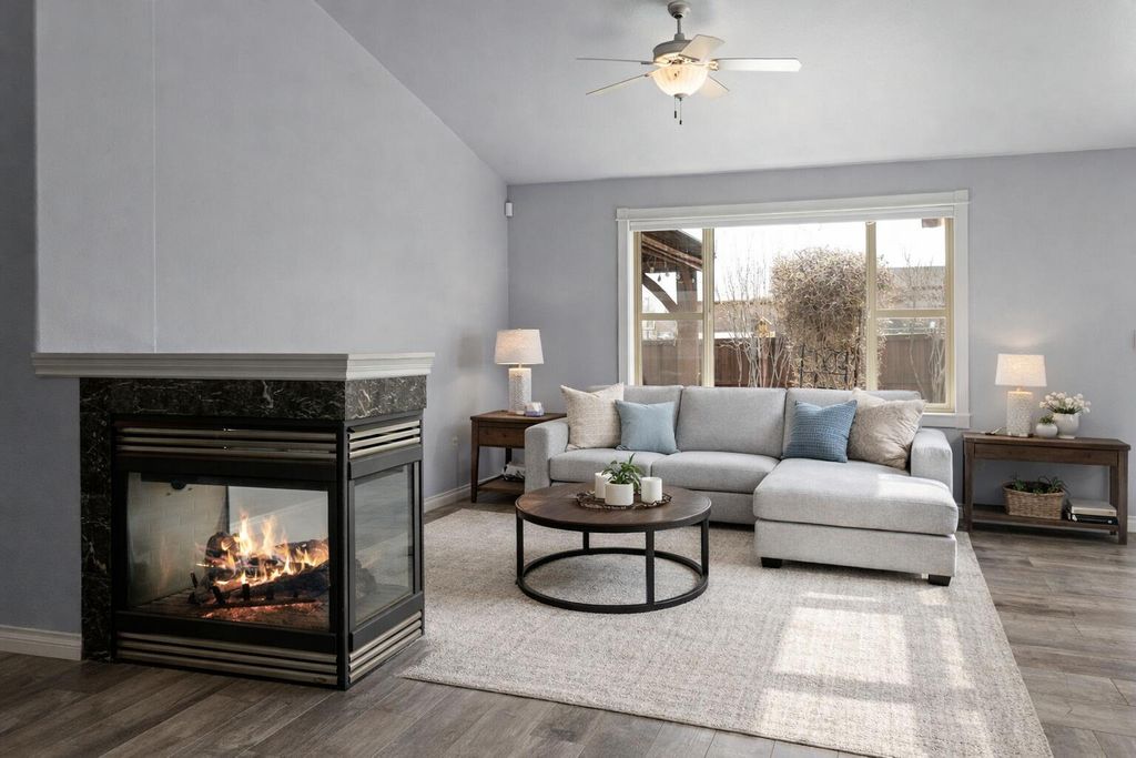 Easy single level living in an exclusive gated community, featuring an open floor plan that has vaulted & coffered ceilings. For your comfort there are natural gas fireplaces in the living room & primary bedroom. The open kitchen features granite slab countertops, breakfast bar, stainless steel appliances & a pantry. The home has been updated with luxury vinyl plank flooring & features carpeting in the bedrooms. In the main bathroom you will find a unique walk-in tub/shower combo. The laundry room has a sink for hand washing items along with a washer & dryer. There is a solar panel system that is seller owned to help with today's ever increasing energy bills. The home has handicap ramps into the home from the garage & one out the back sliding glass door too. The backyard has a large pergola & a retractable awning to shade you from the sun. Your HOA fees cover your landscaping maintenance for the front & back yards. Community amenities offer a park, dog park & walking trails.