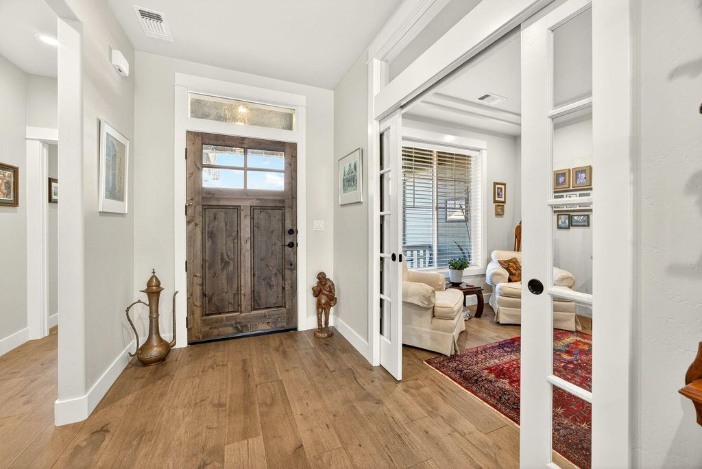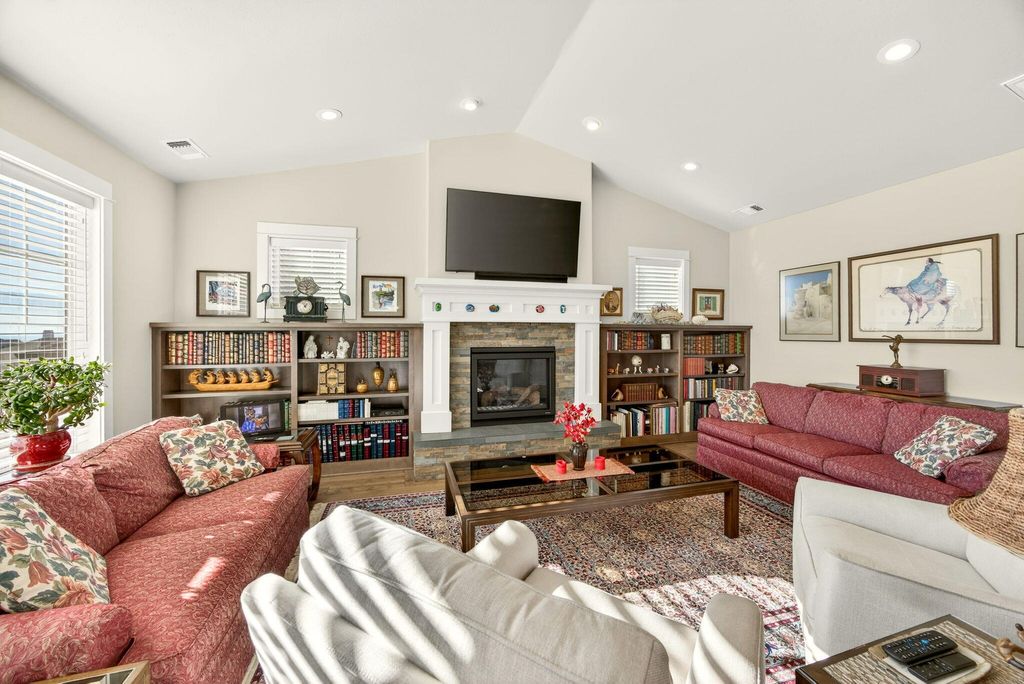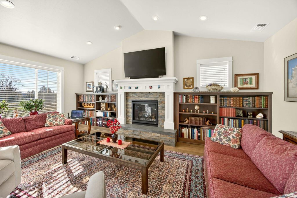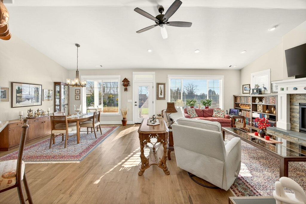 Charming, one-level, Craftsman style home by Mahar Homes in the sought-after Summerfield Subdivision. Filled with natural light, this home showcases stunning built-ins along the fireplace wall and in the dedicated office. Enjoy a beautiful backyard with peaceful mountain views from the covered patio space. Thoughtful finishes include: an open floor plan, quartz countertops, peninsula island kitchen, gas fireplace, custom cabinetry, hardwood floors in the main living areas, and tile floors in the bathrooms and laundry. The primary suite features a walk-in closet, double vanity, and tile walk-in shower. The whole house vacuum system, refrigerator, washer and dryer are included in the sale, if desired. The home is also Earth Advantage certified for comfort and energy efficiency.