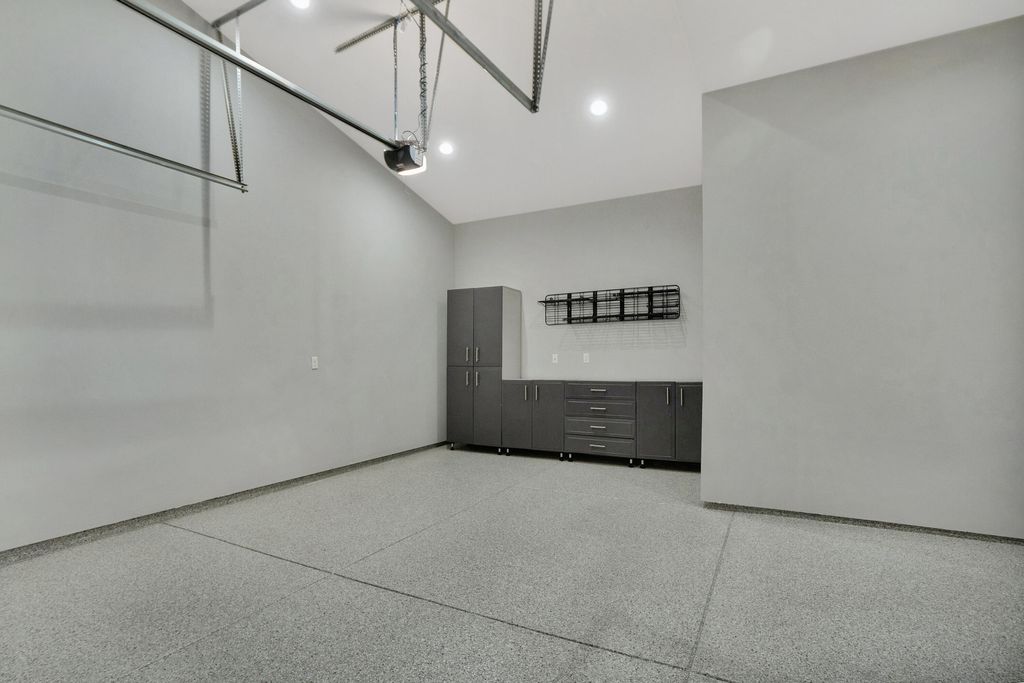 Attached, Concrete, Driveway, Garage Door Opener, Paver Block, Workshop in Garage |