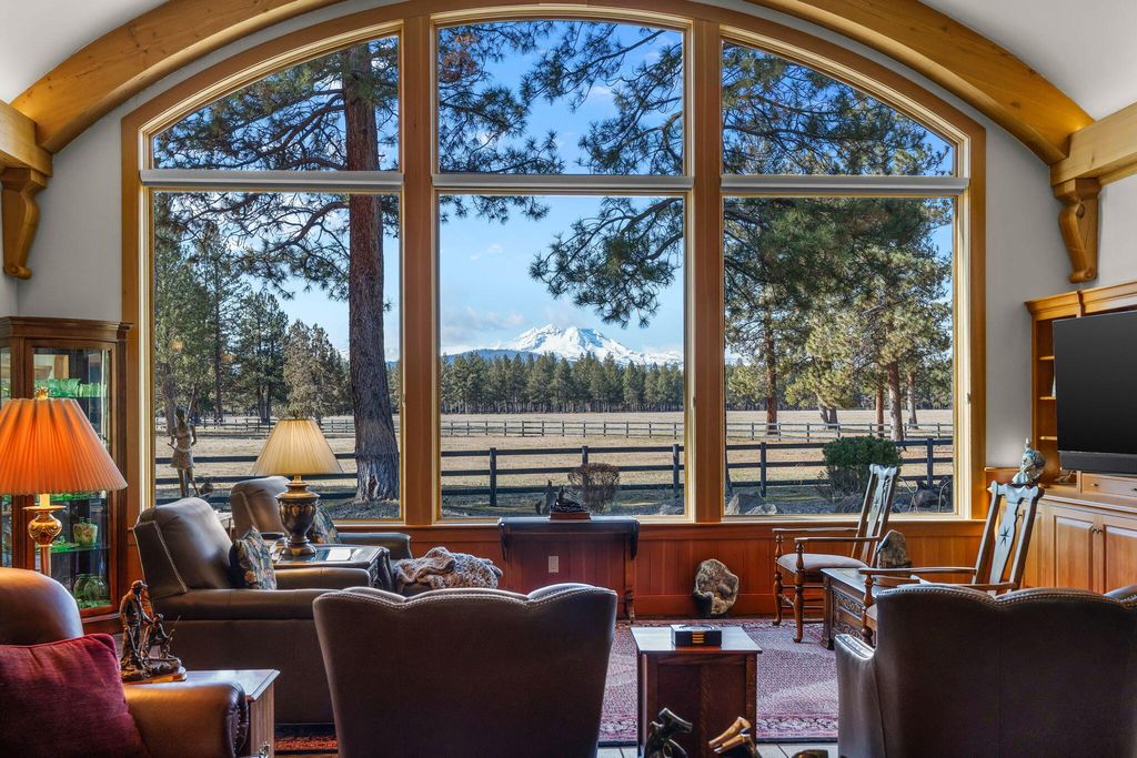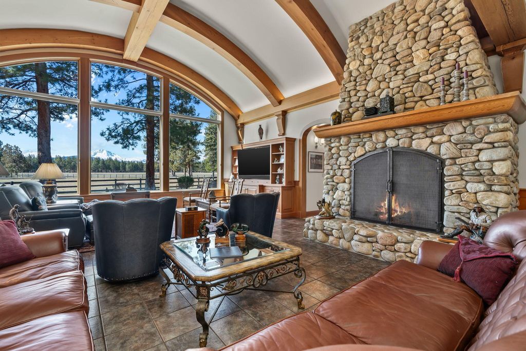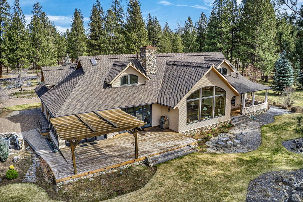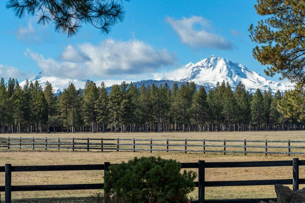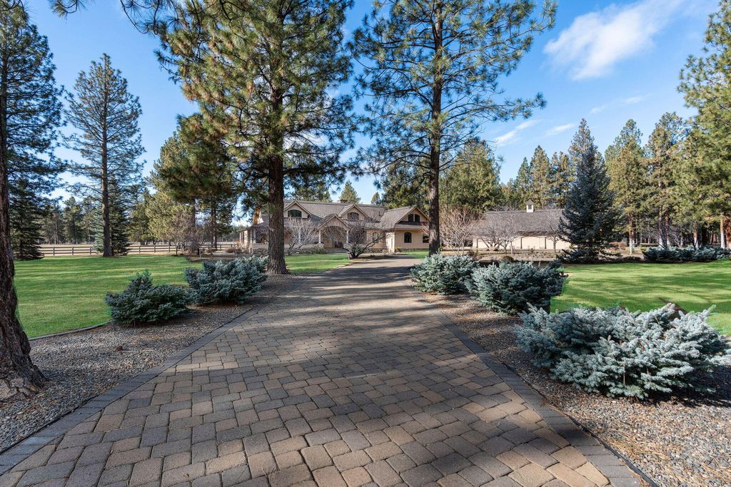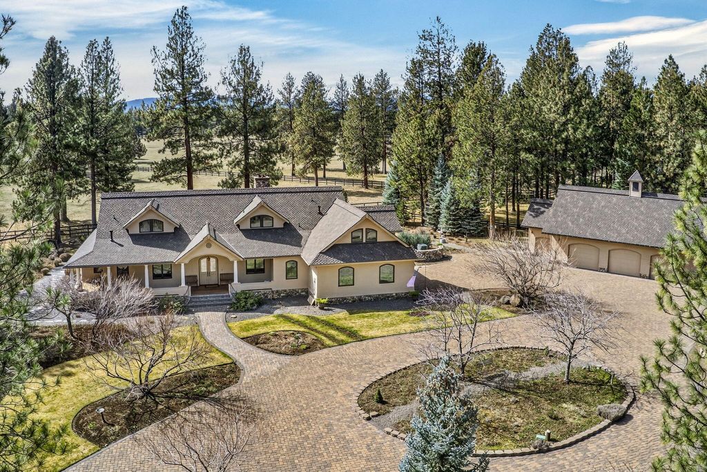 Experience mountain living perfection in the premier equestrian community of Cascade Meadow Ranch. This 4,448 SqFt custom estate on 2.29 private acres boasts stunning Cascade Mountain views & seamless main-floor living. The 4 bed, 5 bath home features soaring vaulted ceilings, exquisite woodwork & Montana river rock fireplaces. A gourmet chef's kitchen offers a Thermador 6 burner range & premium appliances, while the main-level primary suite serves as a luxury retreat with a soaking tub & propane fireplace. Dual stairwells lead to a versatile bonus room, bedrooms & bunk room. The property includes an attached 2 car garage plus a detached 1,510 SqFt shop with a finished upstairs bonus room & 3 car garage. Enjoy a new roof, redwood siding, & covered cedar decks overlooking a landscaped yard with a tranquil waterfall & pond. This gated community provides indoor/outdoor arenas, horse stalls, 3 RV spots, clubhouse, tennis/pickleball & direct access to public lands.