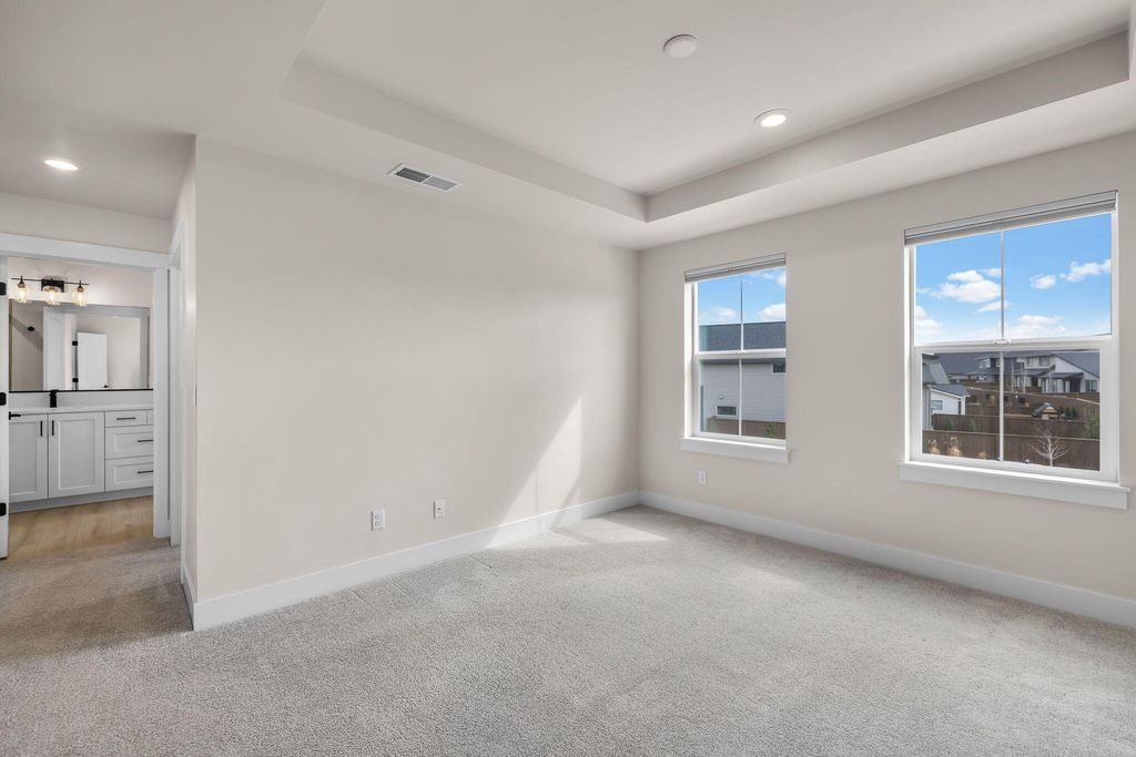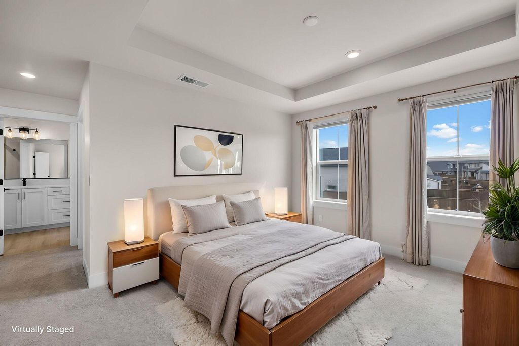 Move-In-Ready, and better than new in Petrosa! This beautifully upgraded Pahlisch Sydney floor plan backs to a peaceful canal and offers the turnkey lifestyle many buyers are looking for. Unlike many new-construction homes, this property is fully finished with backyard landscaping, window coverings, refrigerator, washer & dryer, and even a private hot tub, saving buyers the time and expense of completing a builder-level home. The open-concept main level features a bright great room, dining area, and a stylish kitchen with quartz countertops, luxury wood-laminate flooring, and a convenient butler's pantry for added storage and prep space. Upstairs, you'll find three comfortable bedrooms plus a versatile loft perfect for an office, media room, or flex space. Step outside to a covered patio overlooking the canal and a beautifully finished backyard thoughtfully upgraded with a retaining wall and premium turf, providing a level, usable outdoor space ideal for gatherings, play, or relaxing.