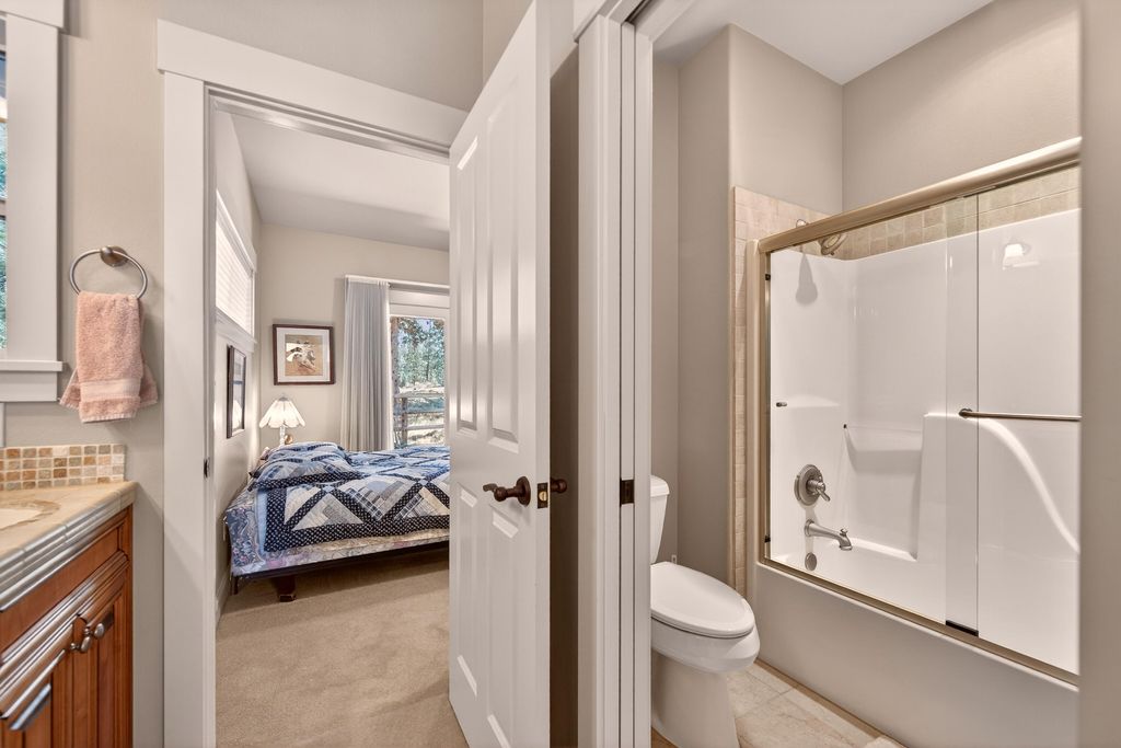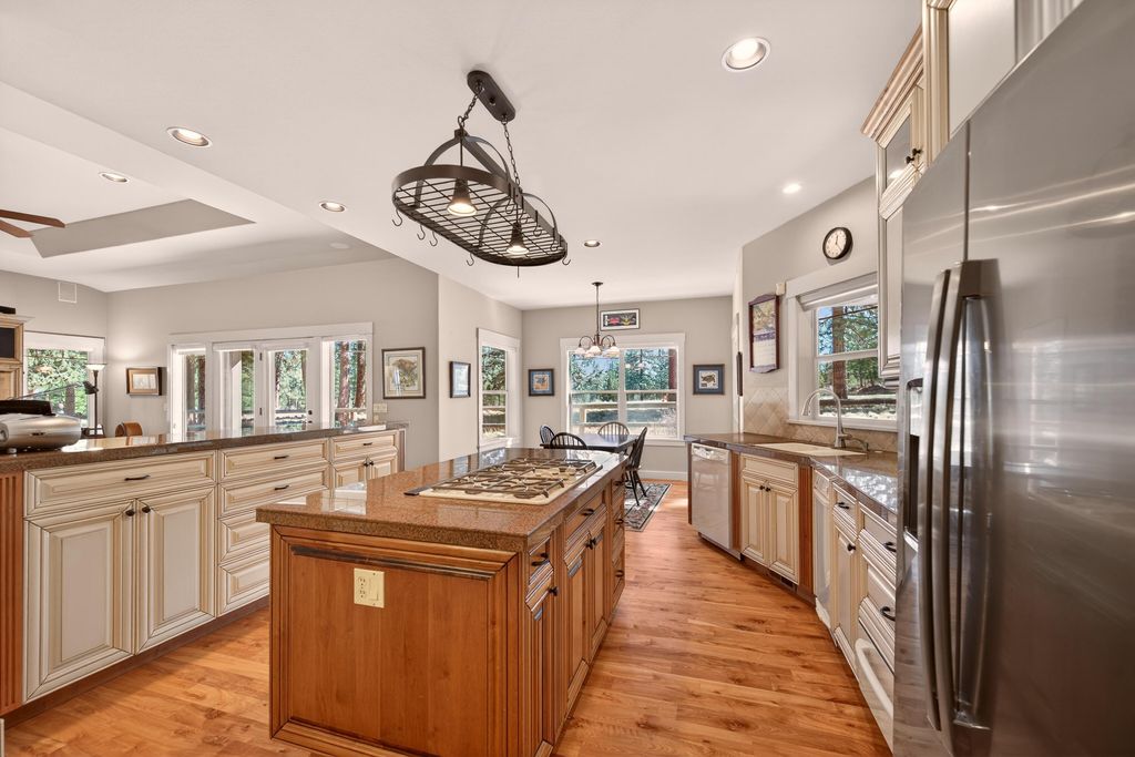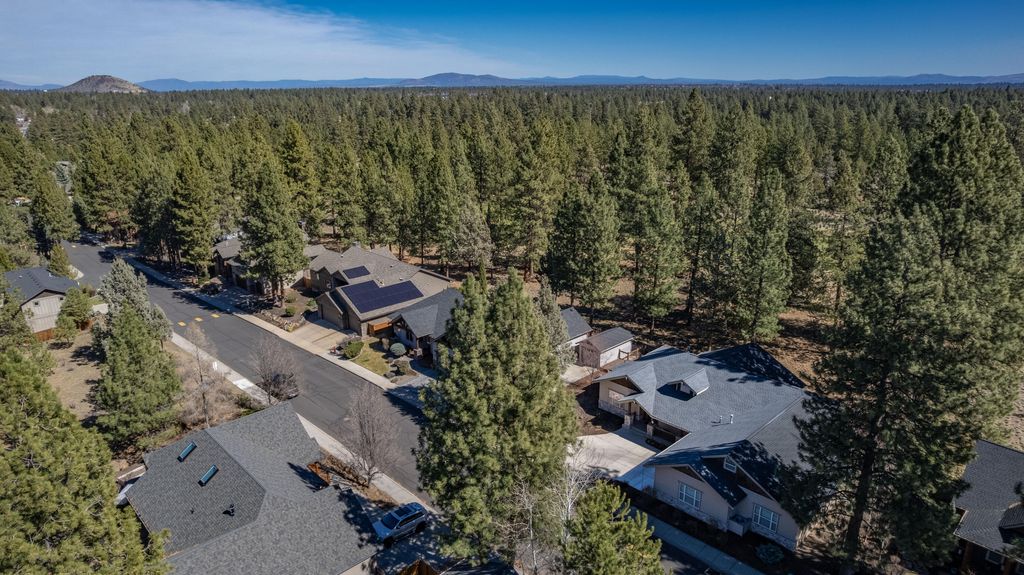Experience refined SINGLE LEVEL living in Mountain Pines, a FIREWISE community located on Bend Golf & Country Club, perfectly positioned on the 5th fairway with a private community gate for members. This quality-built custom home offers an open floor plan with a cozy gas fireplace, built-ins, and abundant storage throughout. The dream kitchen features knotty alder cabinetry, double ovens, a walk-in pantry, hardwood and travertine flooring--ideal for entertaining. Enjoy ideal separation between the sumptuous primary suite & secondary bedrooms with a Jack & Jill bath. The primary retreat boasts dual vanities, an oversized tile shower & an enormous walk-in closet. Recent upgrades include a new roof, HVAC, water heater, garage door with smart opener, and driveway. Oversized heated garage (220 wired) with wine closet, humidifier, sink, and hot/cold spigot. Finished 12x20 bonus space incl in the sq foot. Close to medical, outlet mall, Alpenglow Park & Little Fawn Park & Caldera High School