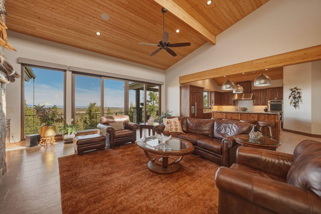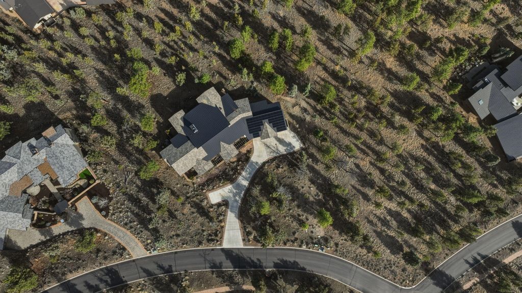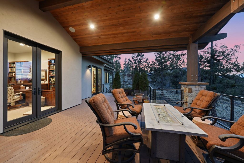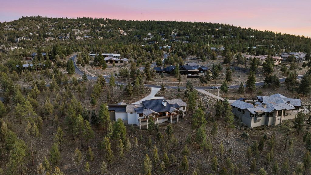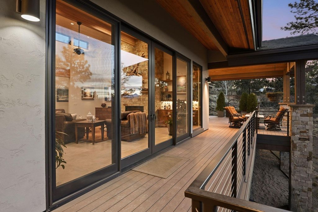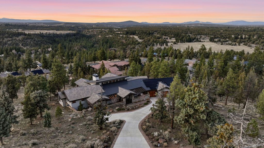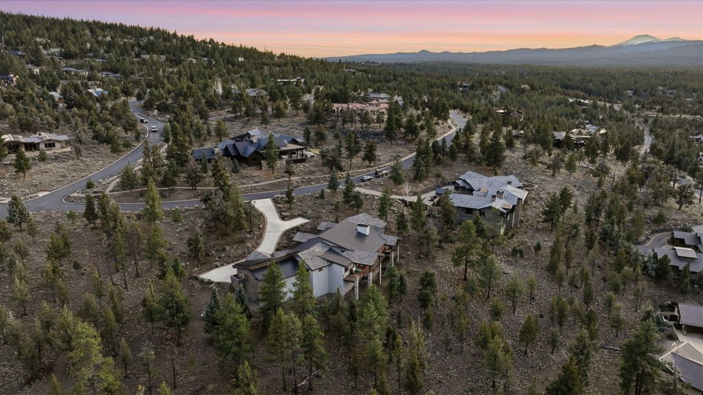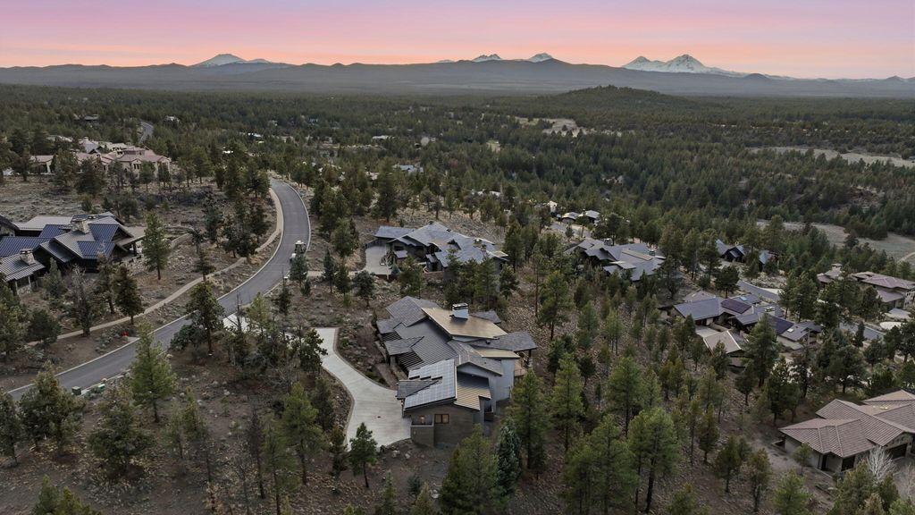 Cascade views define this refined single level residence in Bend's gated North Rim community. Framed by walls of glass, the great room captures the mountain skyline like a living landscape while natural light fills the home throughout the day. Entry begins in a private courtyard where the sound of cascading water sets a calm tone before stepping inside. The kitchen is designed as a natural gathering space, opening to dining and an expansive deck oriented for sunset views over the peaks. The layout offers both comfort and privacy, with a serene primary suite featuring a fireplace and curbless shower, a privately situated ensuite guest suite on the opposite side of the home, and a second guest suite located nearby for flexibility. Additional spaces include a sound insulated theater and dedicated office. North Rim residents enjoy access to the lodge and private trails, minutes from Shevlin Park, Phil's Trail system, Mt. Bachelor access, and Bend's vibrant Westside dining and recreation.