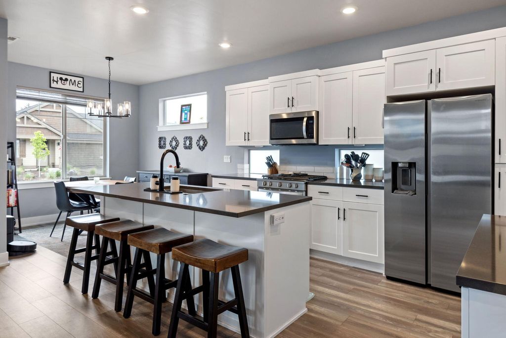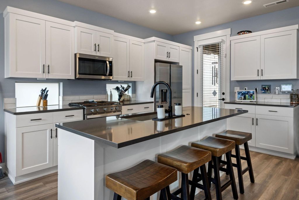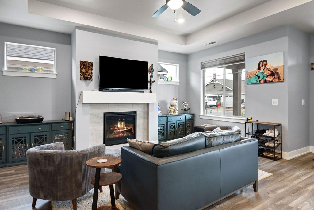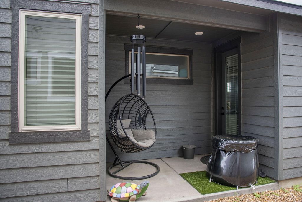 Fantastic layout! Primary suite and living room downstairs with cozy fireplace, gorgeous kitchen and dining area. Easy access to two outdoor covered porches. Upstairs, the huge bonus room has an office nook. Two bedrooms and a full bathroom off the bonus room, makes for terrific separation of living spaces. This stylish Arcadia floorplan by Pahlisch was made even better with several Seller upgrades: A/C, sleek rubberized garage floor and custom shelving in the Primary Suite walk-in closet and Laundry room. Smart features: Ring doorbell, security system linked to garage door and smoke/CO, WiFi thermostat and smart settings for oven and refrigerator! Bright, airy and modern with a cozy fireplace makes this home desirable. Thoughtfully designed, low maintenance lot with spacious alley for garage and driveway access, so there is no neighbor right behind you. Crescent Creek offers awesome amenities like a clubhouse with gym, parks, basketball court and scenic walking paths.