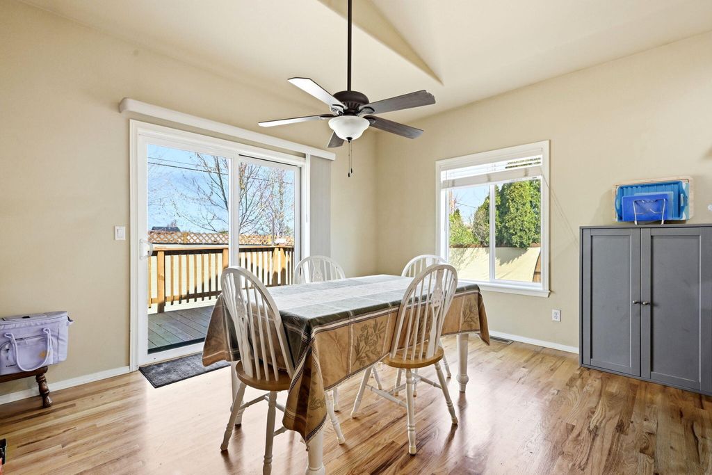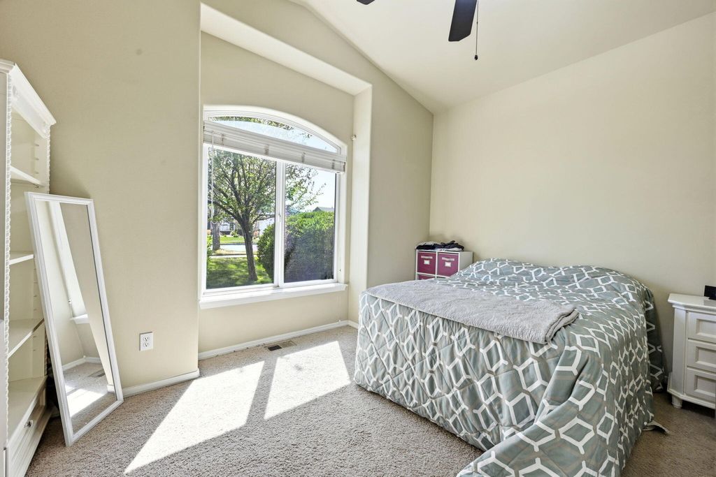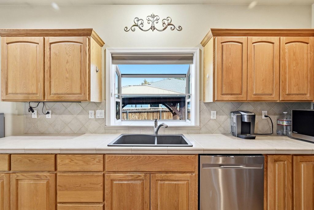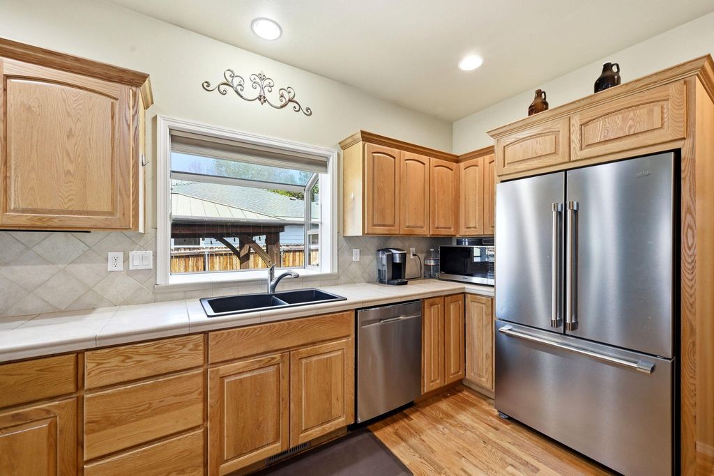 In the kitchen, you'll find stainless steel appliances, a breakfast bar, and a charming bay window overlooking the yard.